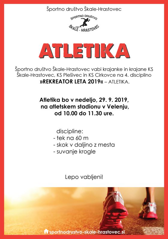 Komaj smo se odpočili od krosa, že je tu naslednje tekmovanje za pokal Rekreator leta 2019, ATLETIKA. Tekmovanje bo potekalo na atletskem stadionu v Velenju, v nedeljo, 29.9.2019. Začetek tekmovanja je ob 10. uri. Vsi tekmovalci bodo tekmovali v treh disciplinah: tek na 60 m, skok v daljino z mesta ter suvanje krogle.