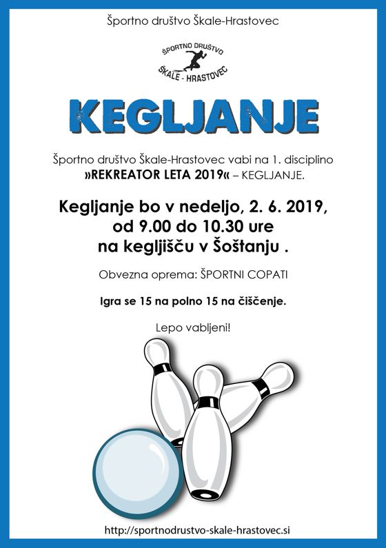 Vabimo vas na prvo disciplino za pokal Rekreator leta 2020, ki bo potekala na kegljišču v Šoštanju. Lepo vabljeni vsi krajani KS Škale-Hrastovec, KS Cirkovce ter KS Plešivec. Več kot nas bo, bolj zanimivo bo!