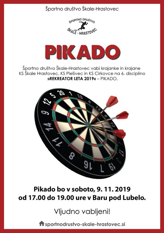 V soboto, 9.11.2019 vas Športno društvo Škale-Hrastovec vabi na zadnjo disciplino za pokal Rekreator leta 2019. Tekmovanje bo potekalo v Baru pod Lubelo od 17.00 do 19.00 ure.